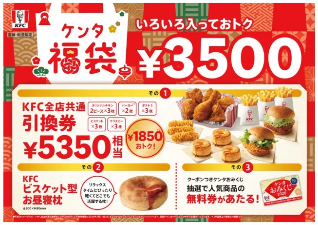 2026年のKFC福袋は、2026年1月1日(木)から全国のケンタッキー店舗で数量限定発売されます。価格は 3,500円(税込)。