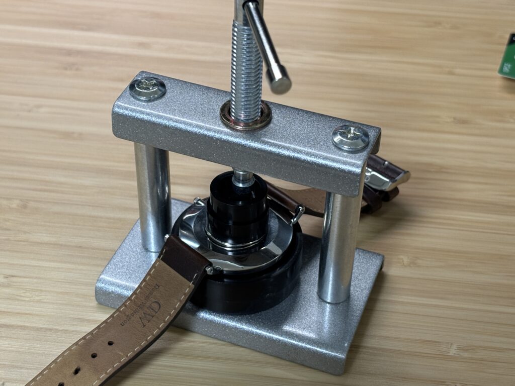 裏蓋閉め器を使って裏蓋をはめ込んでいきます。様々なサイズの土台が用意されているので時計に合ったものを選んで使用します。