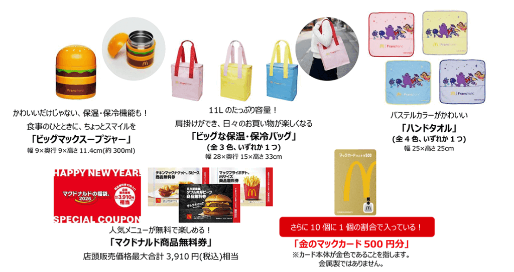 2026年のマクドナルド福袋には、3,910円相当の商品券と、Francfrancとのコラボの「ビッグマックスープジャー」「ビッグな保温・保冷バッグ」「ハンドタオル」などが入っているようです。